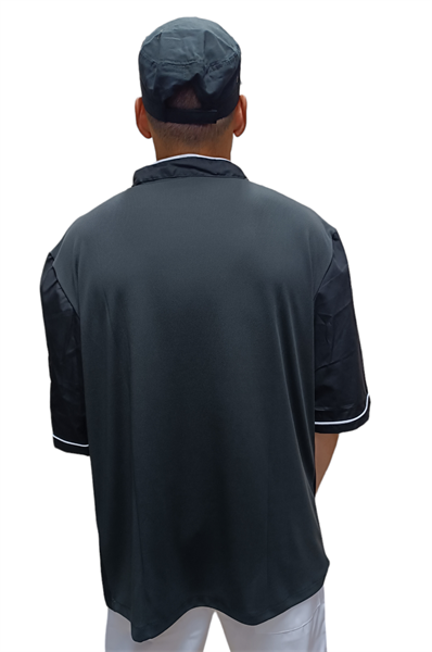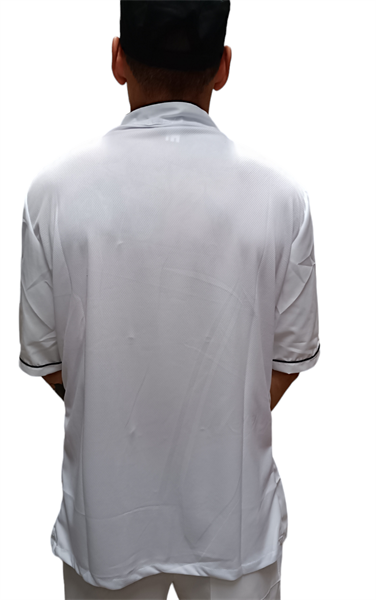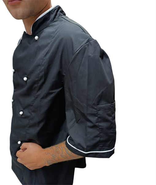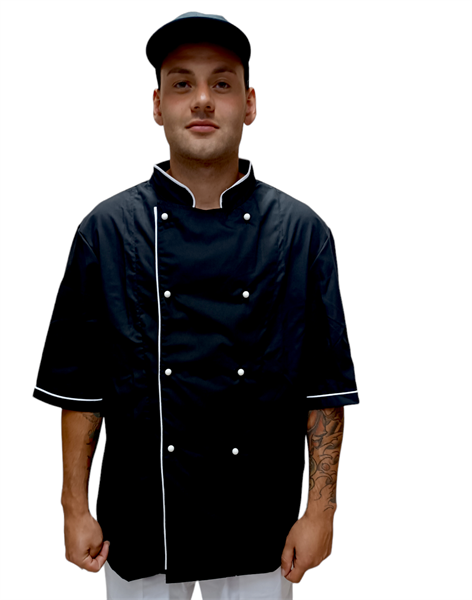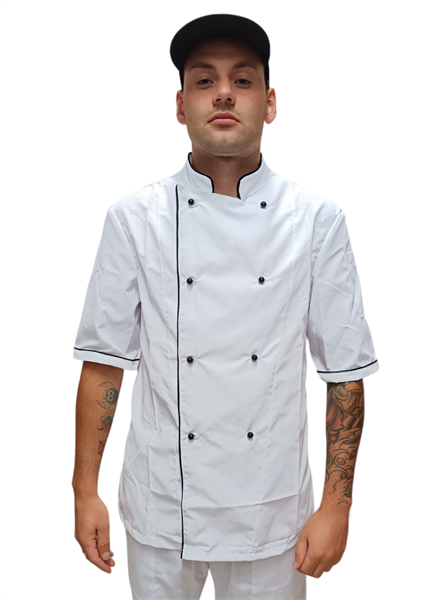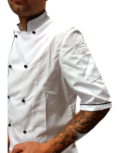 Giacca chef doppio petto, mezza manica, realizzata in Italia, doppio tessuto no stiro, parte posteriore in rete, bottoni in plastica resinata brillante a forma di ciuccio e profili a contrasto.