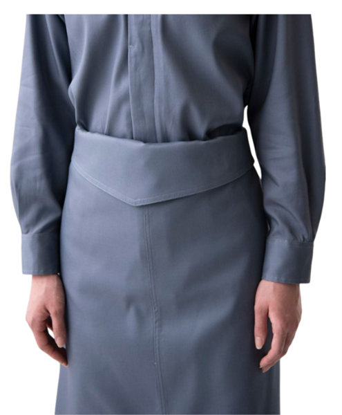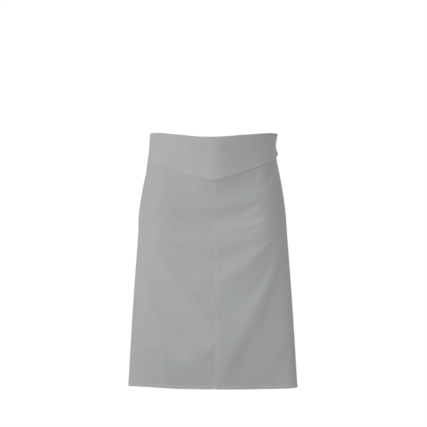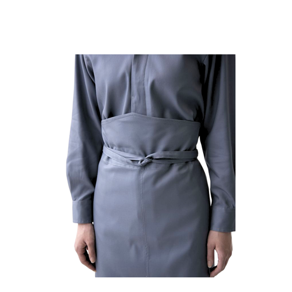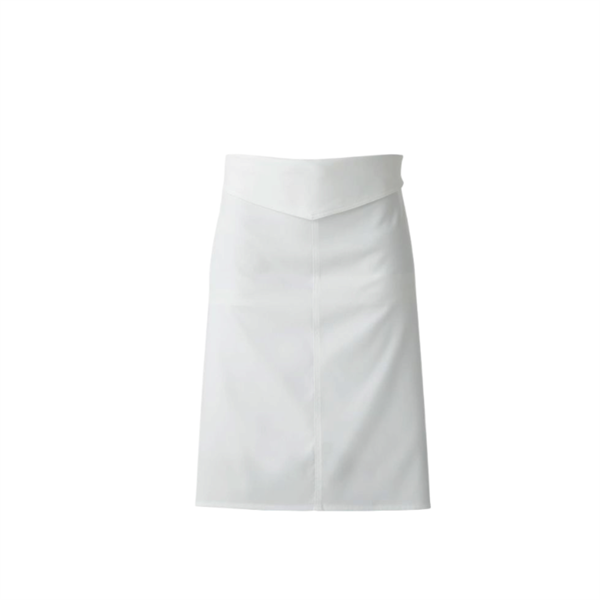 Grembiule Bistrot 2 realizzato in Italia, in tessuto 100% cotone, con tasca laterale e patta per coprire i cordini anche incrociandoli sul davanti per un aspetto pulito e professionale.